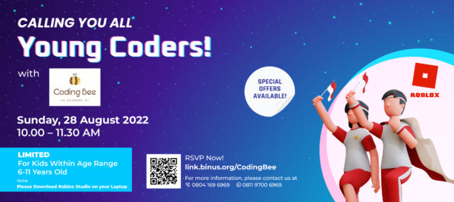 Join us Online on Sunday, 28 August 2022 at 10.00 – 11.30 AM. Book your FREE Session now by scanning the QR Code or sign up through this link below: link.binus.org/CodingBee